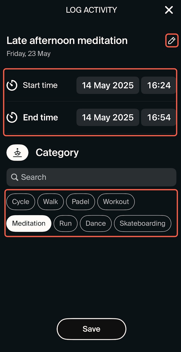 Review your activity details. You can edit the name, category and start and end time.