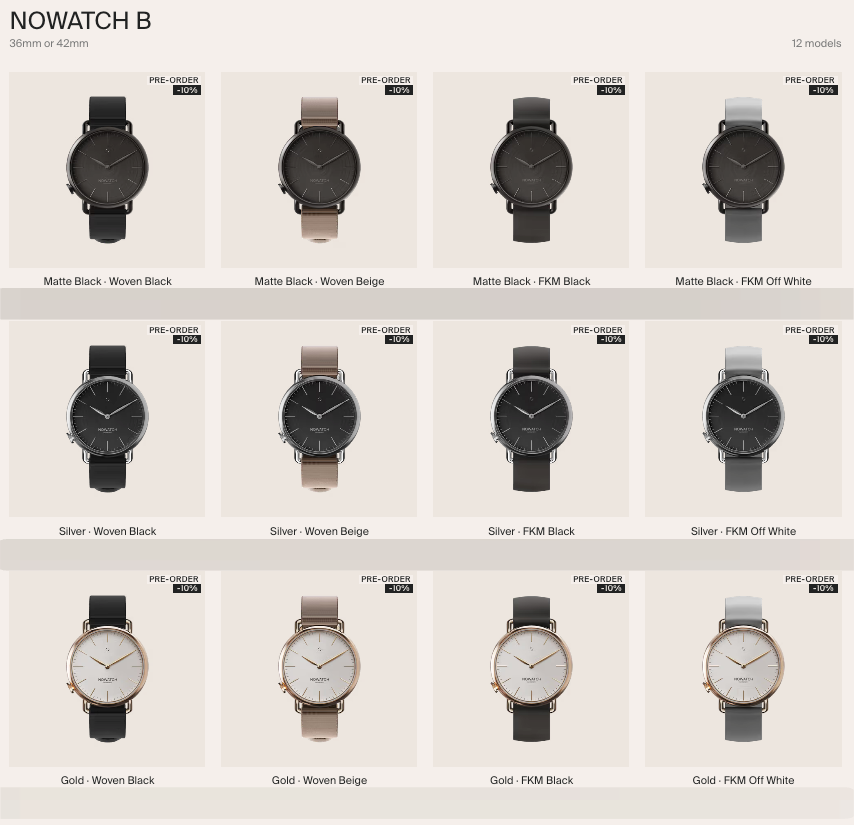 There are 12 NOWATCH B and each model is available in two sizes, 36mm and 42mm.