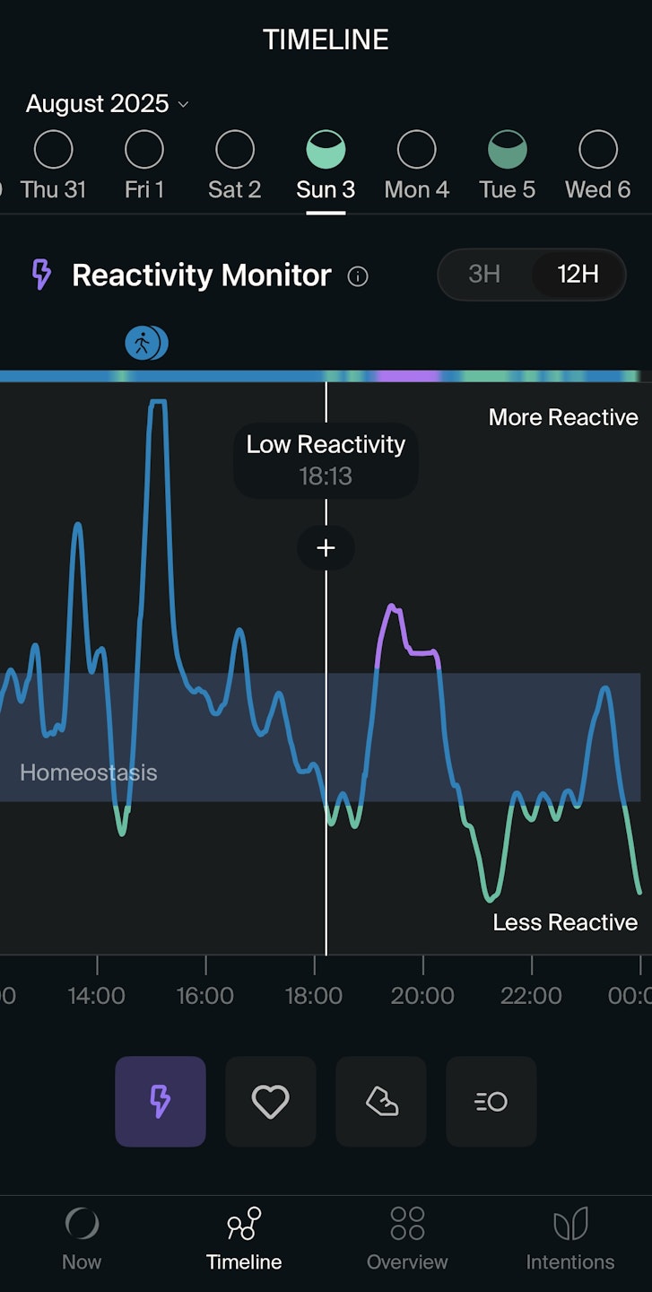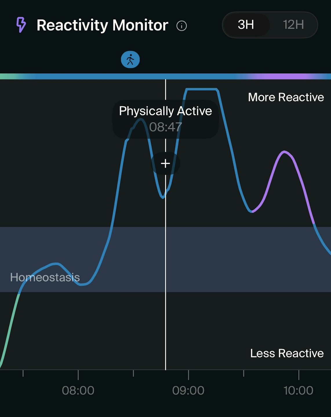 When the Reactivity Monitor shows reactivity above the Homeostasis, it means your body is actively responding to a situation—whether it's a stress response (purple) or physical activity (blue). Recognizing these moments can help you identify your triggers and manage them more effectively.