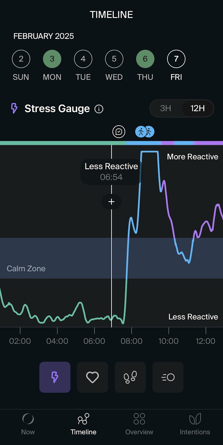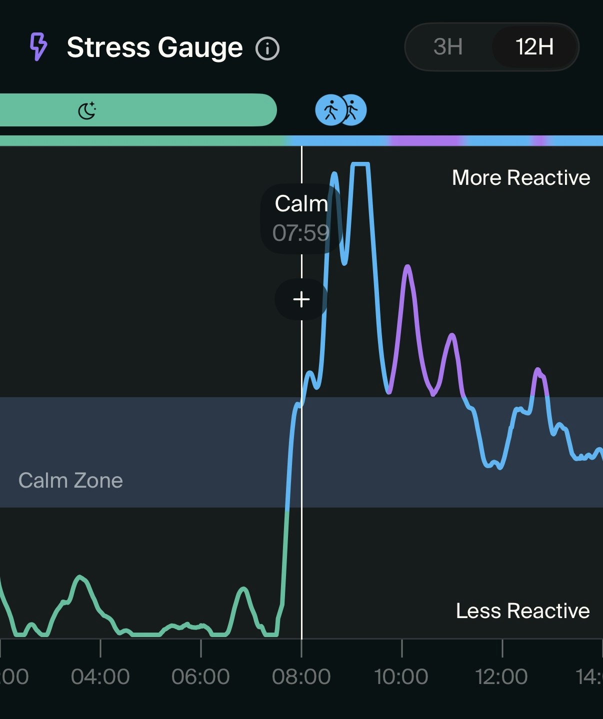 When the Stress Gauge shows reactivity above the Calm Zone, it means your body is actively responding to a situation—whether it's stress (purple) or physical activity (blue). Recognizing these moments can help you identify your triggers and manage them more effectively.